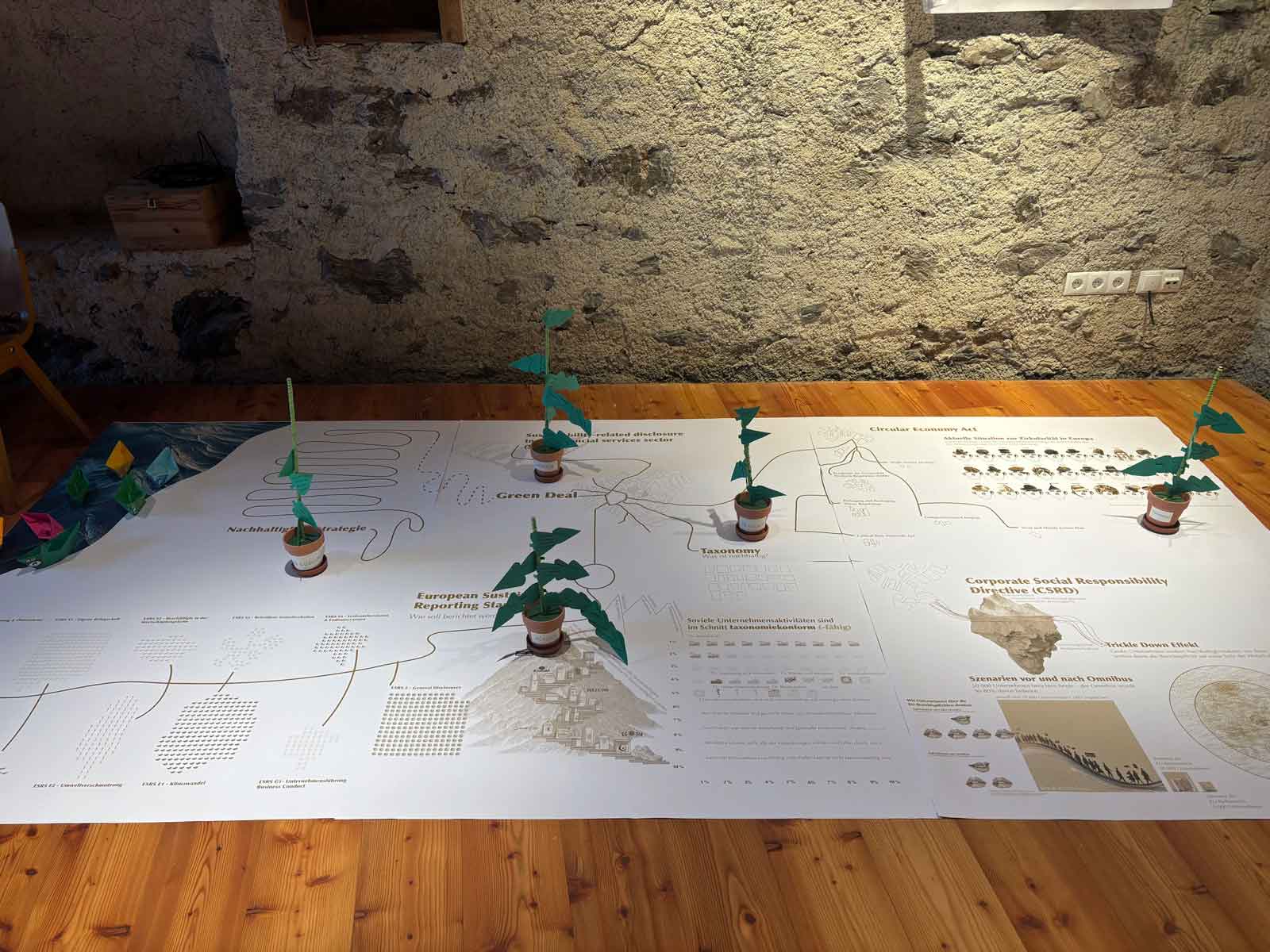 The growth of these plants follows the Wiki Survey principle, introduced by Matthew Salganik in Bit by Bit (2017). Unlike traditional questionnaires, Wiki Surveys invite participants to add their own ideas and collectively shape the dataset. This open format allows data to grow organically rather than being constrained by pre-defined options — reflecting the inherently collaborative and evolving nature of sustainability work. In Terra Nova, this principle was applied through an open survey in which participants shared their perspectives on the challenges and opportunities of sustainability practice.